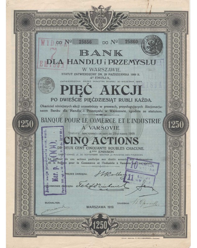 Titre de 5 Actions de 250 Rbl chacune, 4ème émission - Varsovie 1919