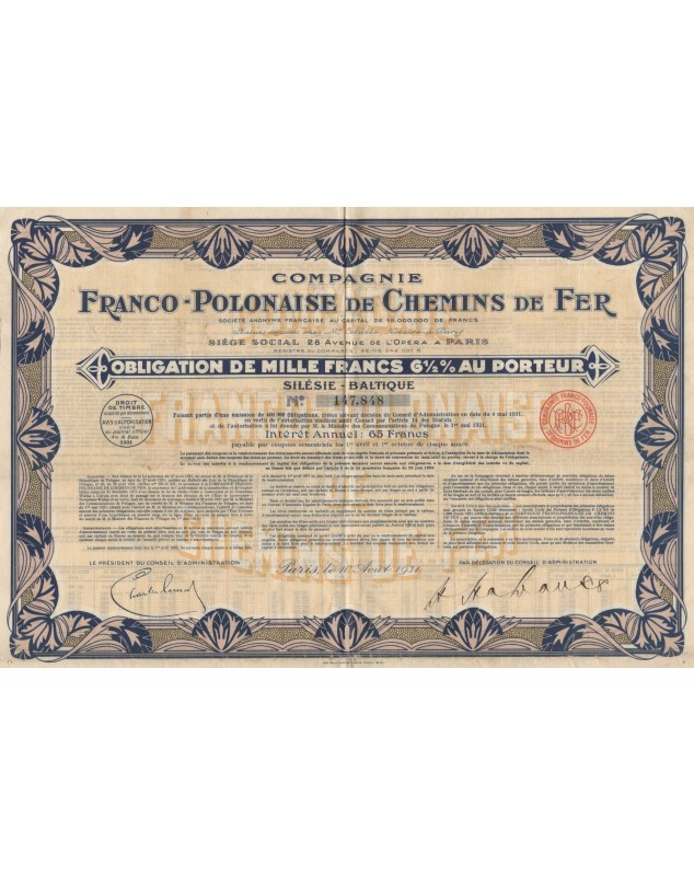 Obligation 6,5% de 1000 francs au porteur émise à Paris en 1931.