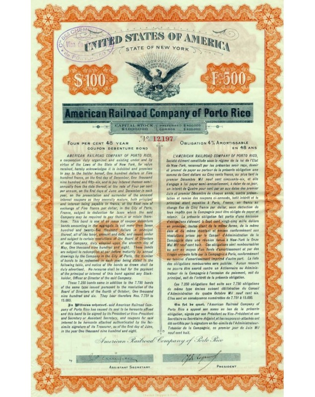 Obligation 4% de 500F ($100) - Porto Rico/New York 1908