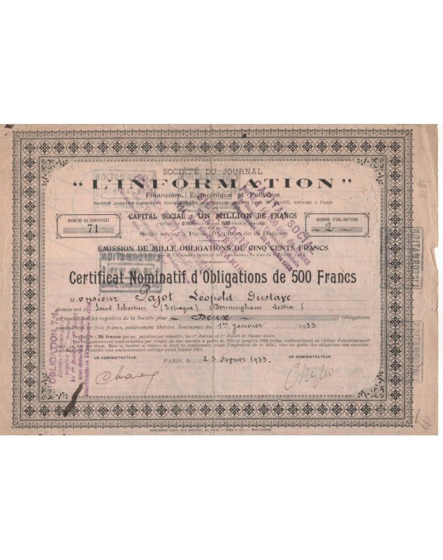 Certificat nominatif d'obligations de 500F - Paris 1933