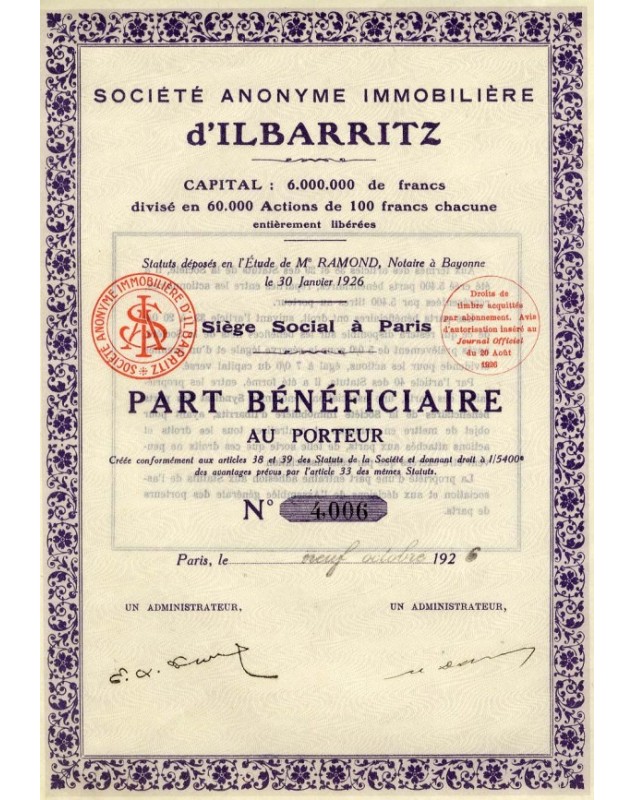 Part de Fondateur - Paris 1926