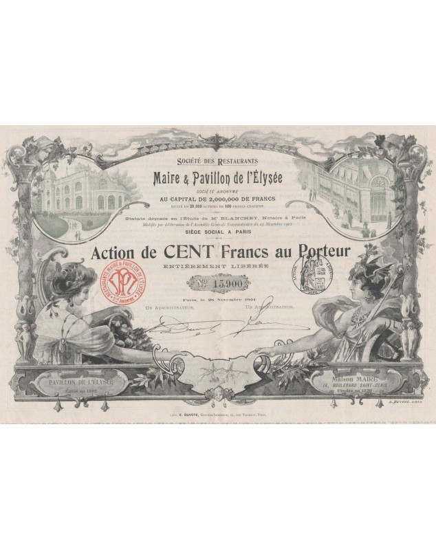 La société avait pour objet l'exploitation à Paris des Restaurants Maire, 1 et 3 boulevard de Strasbourg et 14-16 boulevard Saint-Denis, du Pavillon de l'Elysée (Carré Marigny, édifié en 1898), anciennement Pavillon Paillard.