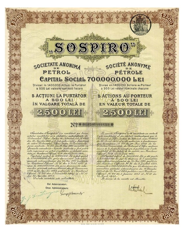 Titre de 5 Actions de 500 Lei chacune - 1923