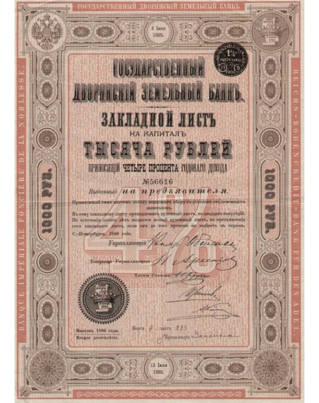 Banque Impériale Foncière de la Noblesse - 1000 Rbl 4% 1896