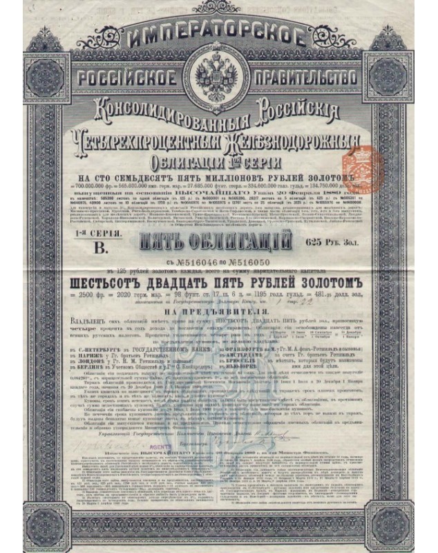 Titre de 5 Obligations de 125 Roubles chacune, 1ère série - 1889