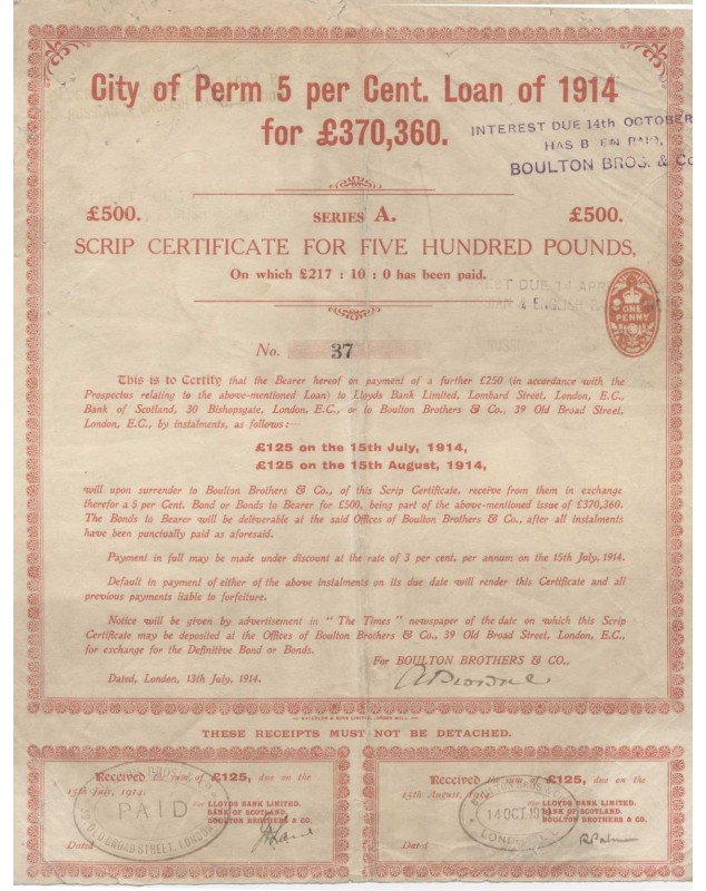 Ville de Perm - Emprunt 5% 1914 Serie A