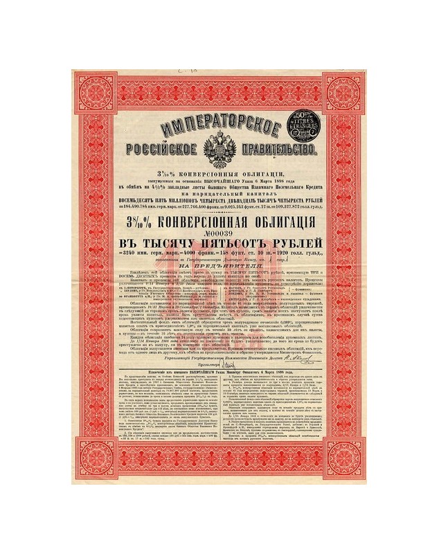 Gouvernement Impérial de Russie - Obligation de Conversion 3%. 1500 Rbls