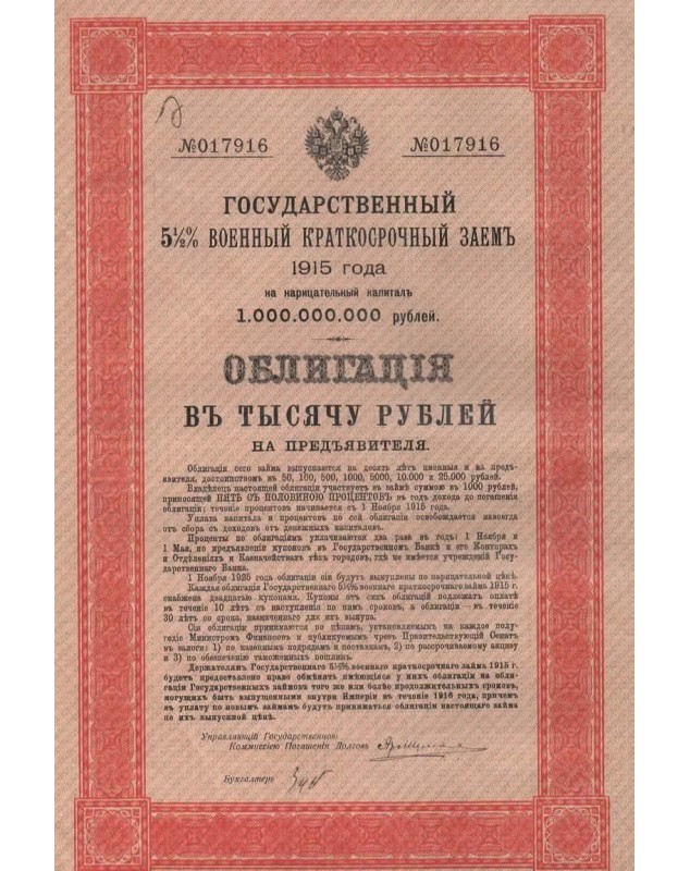 Emprunt militaire russe court-terme 5,5% 1915 (1.000 Rbl)