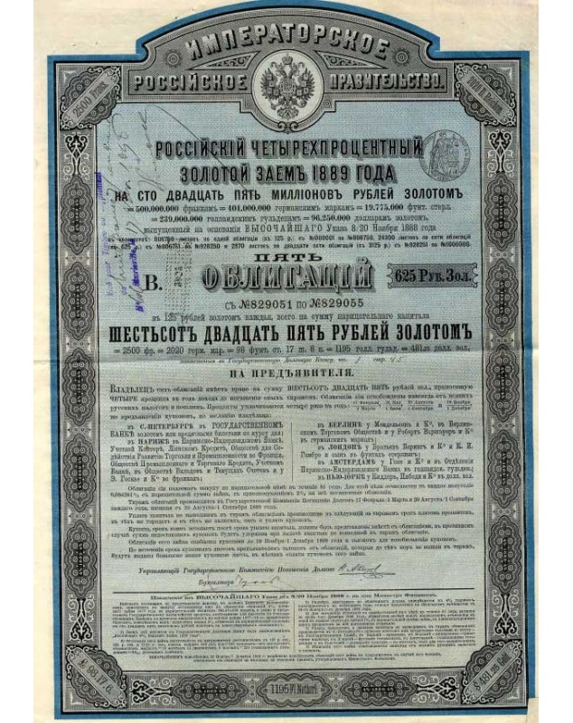Gouvernement Impérial de Russie - Emprunt Russe 4% Or 1889. 625 Rbl