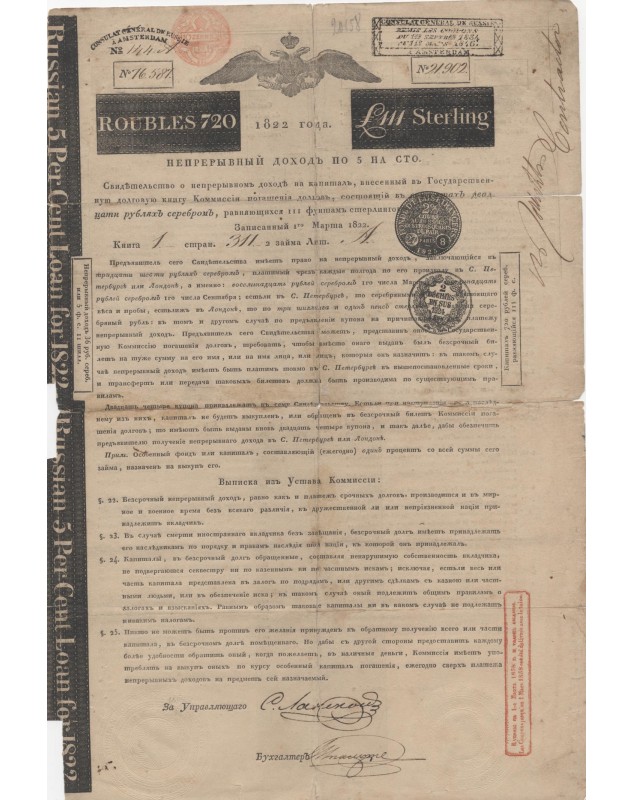 Obligation de 720 Roubles émise à Saint-Pétersbourg en 1822, Avec signature manuscrite originale de Nathan Rothschild verticalement en haut à droite.