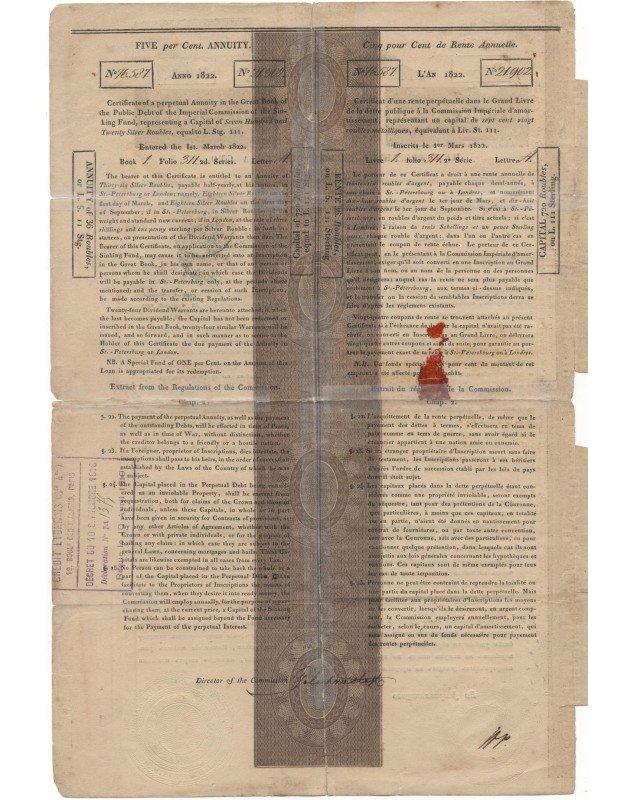 Emprunt Russe 5% Rente perpétuelle 1822 (signé Rothschild) - 720 Rbl