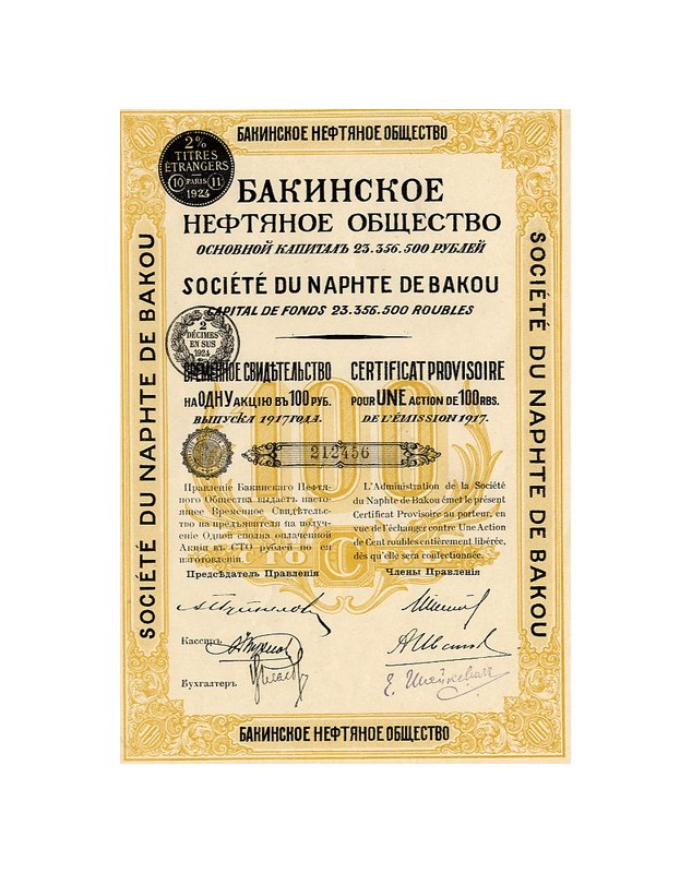 Certificat Provisoire pour 1 action de 100 Rbl - Bakou 1917