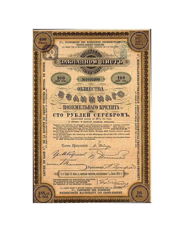 Lettre de Gage 5% de 100 Rbl ou 400F ou 16£ - 1875