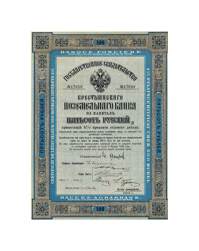 Banque Foncière pour faciliter aux paysans l'acquisition de terres - 4,5% 500 Rbl 1912 1ère série