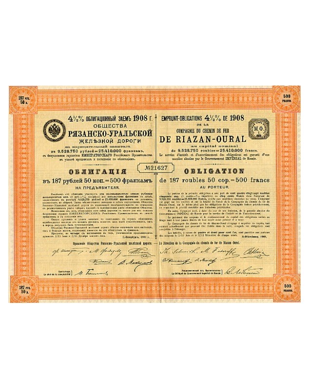 Cie du Chemin de Fer de Riazan-Oural - Emprunt 4,5% 1908