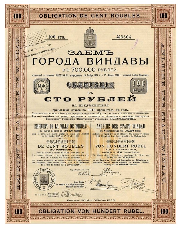 L'emprunt visait à couvrir les dépenses effectuées pour la construction d'un pont de chemin de fer sur la rivière de Windau et d'un chemin de fer secondaire allant vers ce pont.