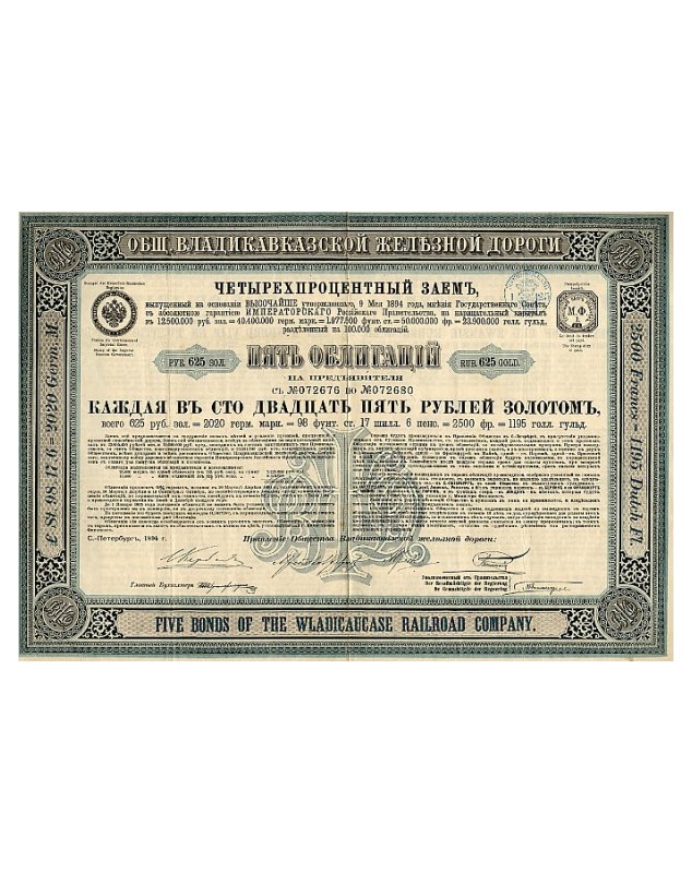 Titre de 5 Obligations de 125 Rbl chacune - St-Pétersbourg 1894