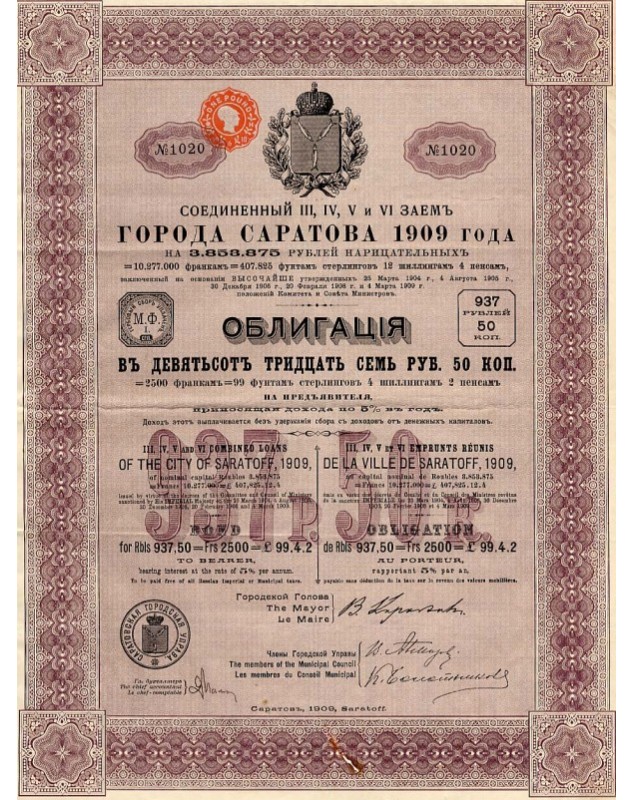 Obligation 5% de 937,50 Rbl ou 2500F ou 99,40£ - Saratoff 1909