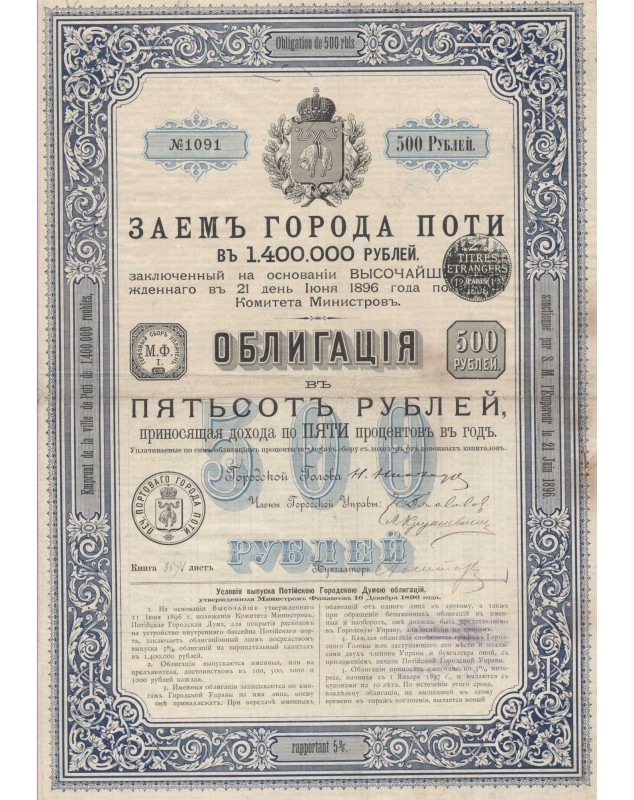 Ville de Poti - Emprunt 5% 1896. 500 Rbl