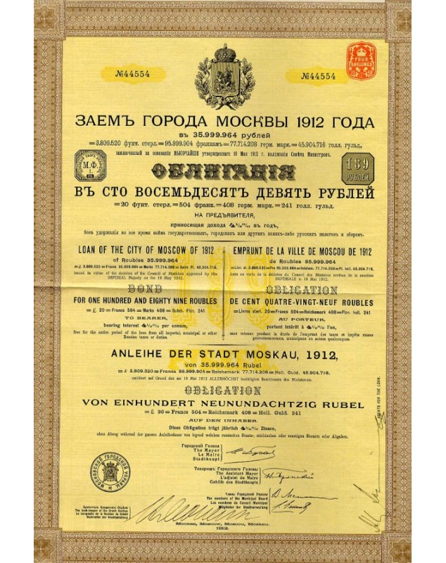 Obligation 4,5% de 189 Rbl ou 20£ ou 504F ou 408 Reichsmarks ou 241 Florins holl. - Moscou 1912