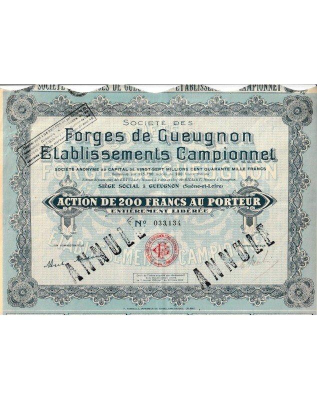 Action de 200 francs au porteur émise à Gueugnon (Saône-et-Loire) en 1932.