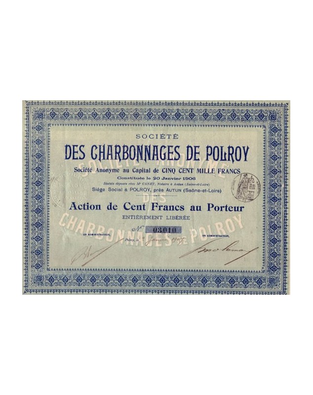 Action de 100F - Polroy (Autun, Saône et Loire) 1907