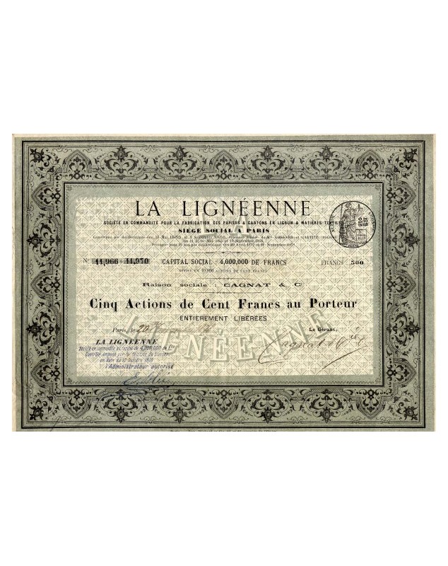 Raison sociale : Cagnat & Cie. Fabrication des Papiers & cartons en Lignum & matières textiles.