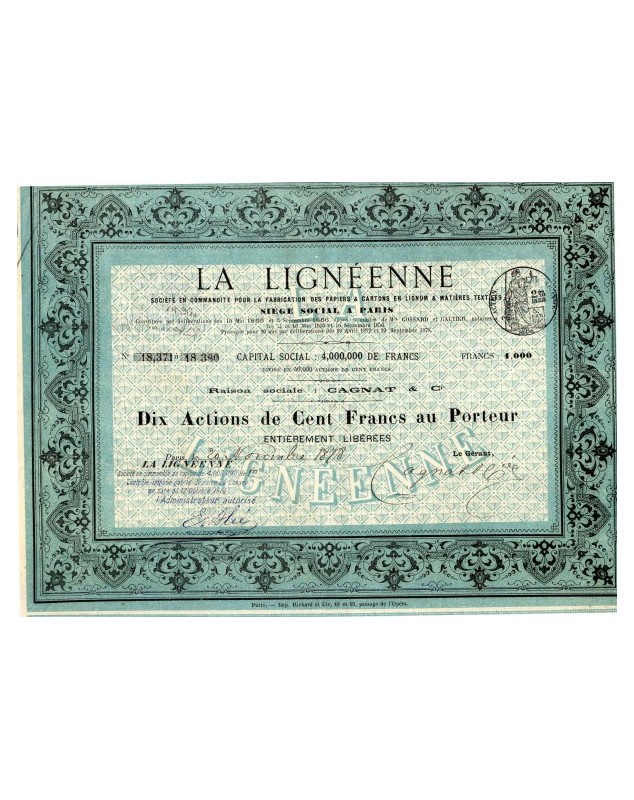 Titre de 10 Actions de 100F- Paris 1878