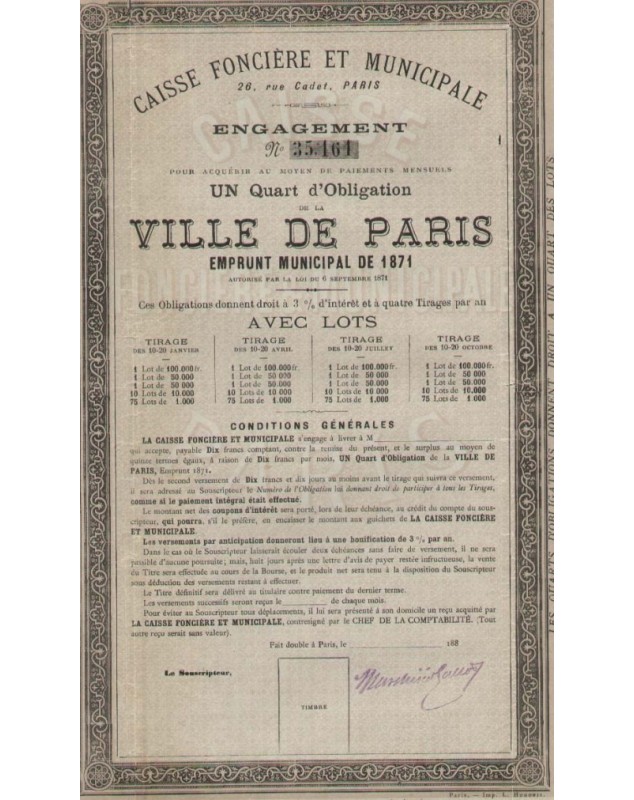 Ville de Paris - Emprunt Municipal de 1871. Caisse Foncière et Municipale