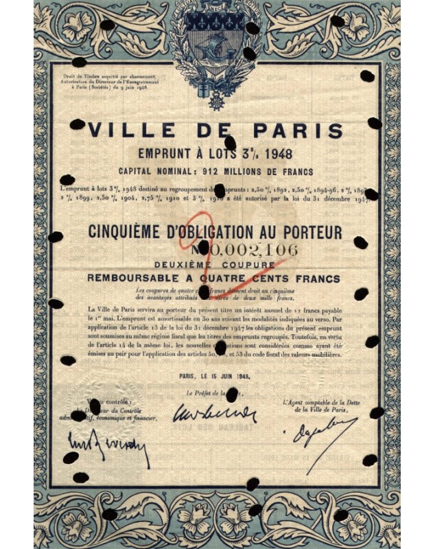 Ville de Paris - Emprunt à Lots 3% 1948 (annulé)
