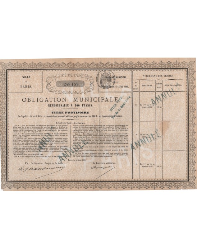 Obligation Municipale remboursable à 400F, Titre provisoire - Paris 1869