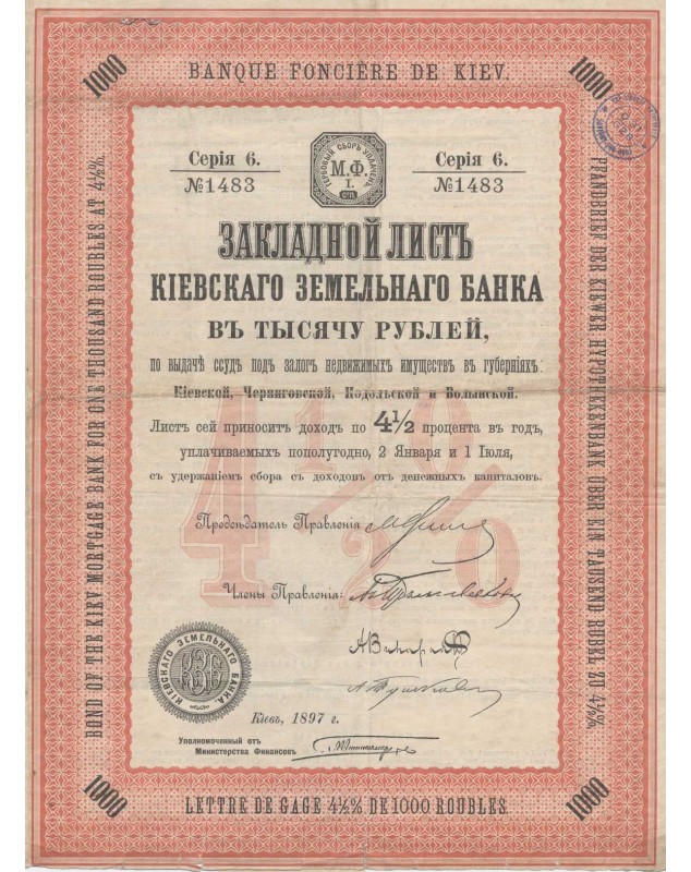 Lettre de Gage 4,5% de 1000 Roubles - Kiev 1898