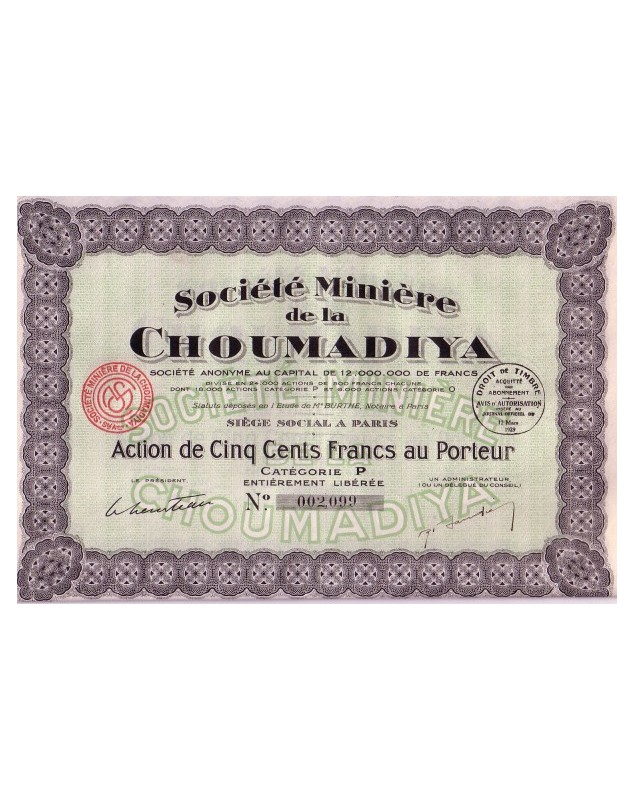 Action de 500 francs au porteur émise à Paris en 1929.