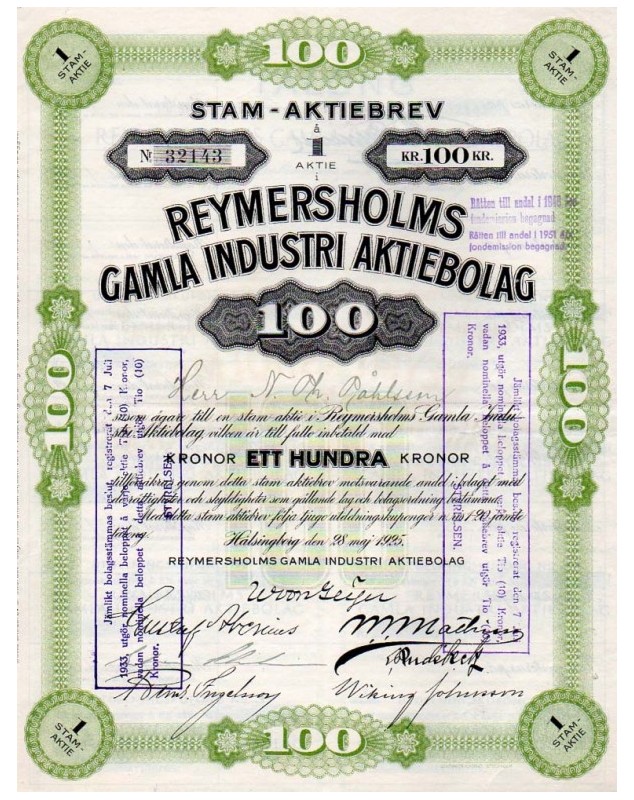 Titre de 100 Cour. - Hälsingborg 1925