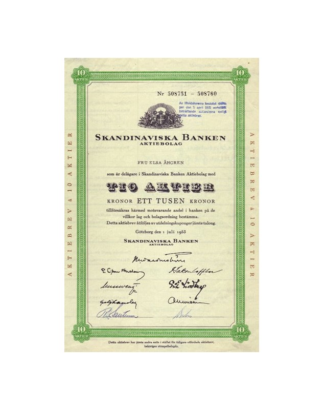 10 Aktier Kronor Ett Tusen Kr. - Göteborg 1953