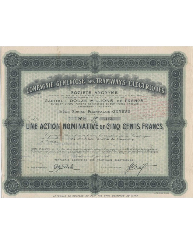 Titre d'1 Action Nominative de 500 francs émis à Plainpalais, Genève, en 1911.