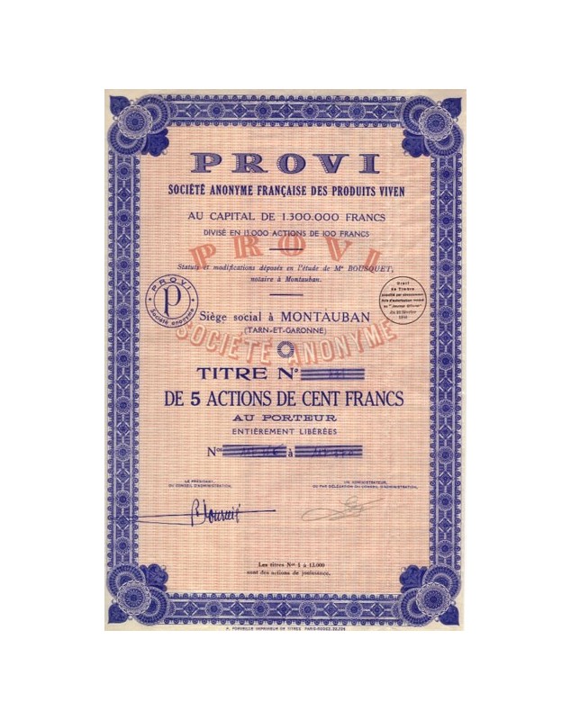 Titre de 5 Actions de 100 francs émis à Montauban (Tarn-et-Garonne) en 1940.
