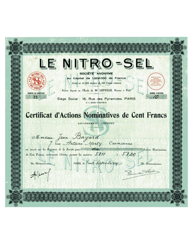 Cert. de 10 Actions de 100F chac. - Paris 1929