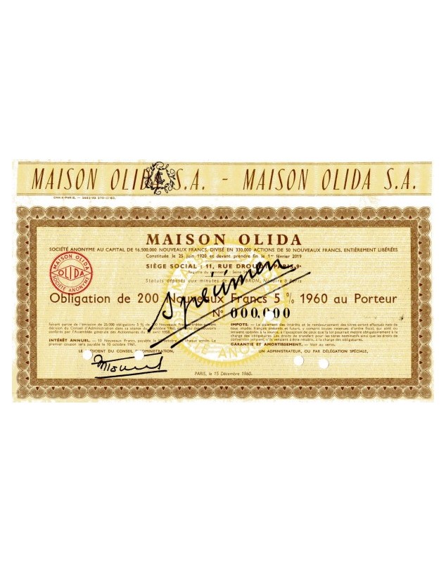 Oblig. de 200NF 5% - Paris 1960 -Specimen