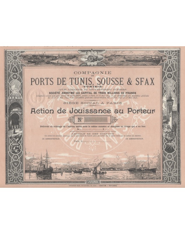 Action de Jouissance datée de Paris 1896, avec garantie du gouvernement tunisien.