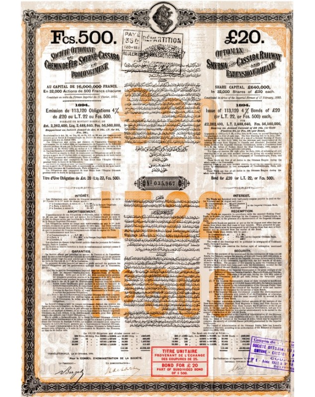 Obligation de 20£ ou L.T. 22 ou 500 francs au porteur émis à Londres par la Banque impériale Ottomane en 1894.
