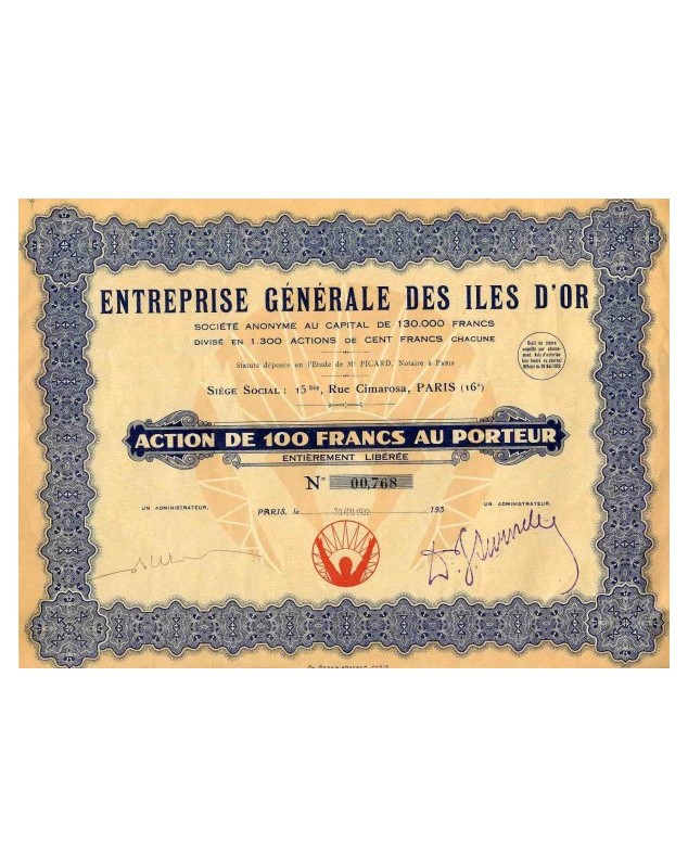 Siège social au 15 bis rue Cimarosa à Paris 16ème. Petite émission : 1300