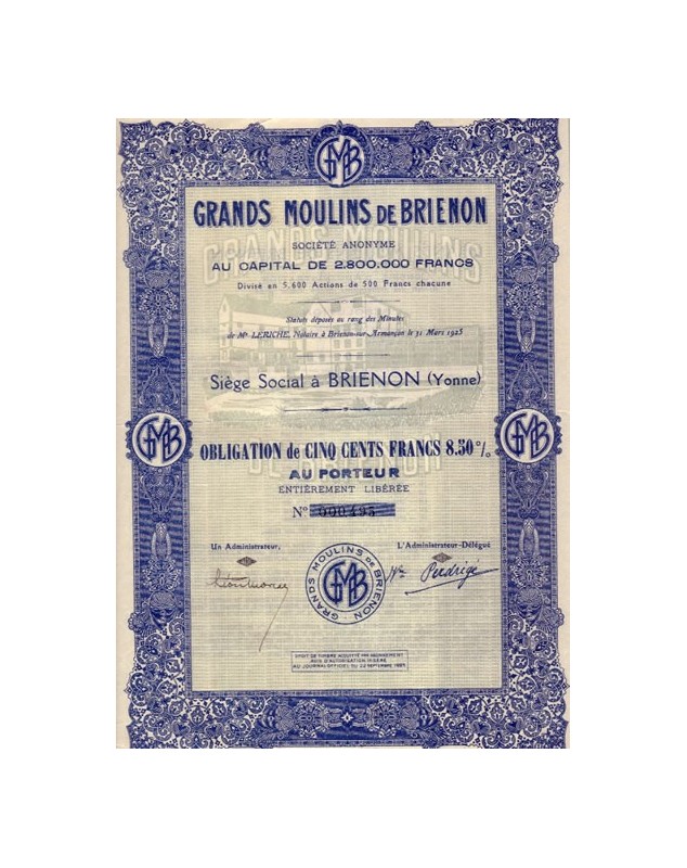 Obligation de 500F 8,5% - Brienon (Yonne) 1925