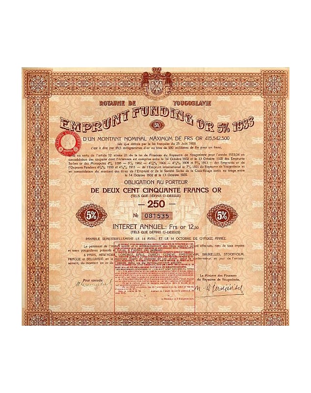 Royaume de Yougoslavie - Emprunt Funding or 5% 1933