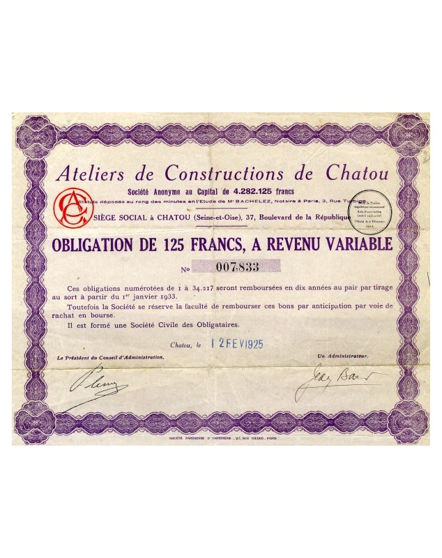 Obligation de 125F - Chatou 1925